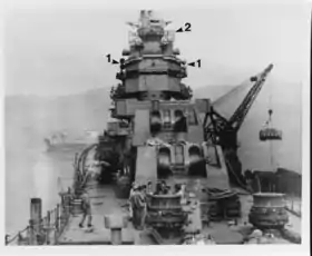 - Полноценными орудийными башнями они не являлись, так как по сути представляли собой закрытые установки на кольцевом палубном погоне. Перегрузочное отделение было неподвижным, вращающегося барбета и подбашенного отделения как такового у них не было. Ось вращения корпуса установки проходила до уровня средней палубы для установок № 1 и № 3 и верхней палубы для установки № 2. См. книгу Лакруа и Уэллса, p.568.
