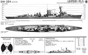 ![]() ТТХ и идентификационные параметры легкого крейсера «Лейпциг», изданные отделом Военно-Морской разведки Военно-морского министерства США |