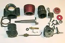Впуск смеси осуществлялся через дисковый золотник (на первых моделях текстолитовый), который вращался на задней стенке картера. Карбюратор состоял из жиклера и регулирующей иглы. Радиатор цилиндра, опорная и шайба под гайку анодировались, в красный цвет.