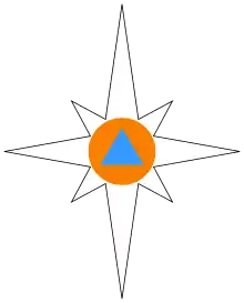 Малая эмблема МЧС России — вытянутая по вертикали звезда белого цвета с восемью лучами. В центре звезды в круге оранжевого цвета расположен равносторонний треугольник голубого цвета с основанием внизу. Утверждена Указом Президента Российской Федерации от 15 ноября 1997 г. № 1231 «О флаге и геральдическом знаке — эмблеме Министерства Российской Федерации по делам гражданской обороны, чрезвычайным ситуациям и ликвидации последствий стихийных бедствий»[42]. Используется на нарукавных и нагрудных знаках, ведомственных наградах, для маркировки техники и имущества.