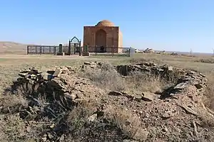 На юго-западной стороне от мавзолея расположено современное надгробие с надписью на кириллице и древнетюркском[2].