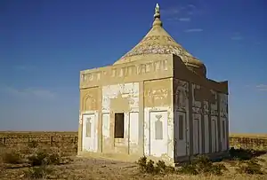 Мавзолей в плане четырёхугольный, поверх цилиндрического барабана возвышается изящный шлемовидный купол.[1] Высота мавзолея совместно с куполом составляет 9,5 м, длина 6,6 м, ширина 5,8 м.[1] Имеется одно окно.[1] Внутри мавзолея установлен кулпытас (надгробный памятник в виде вертикальной стелы).[1]