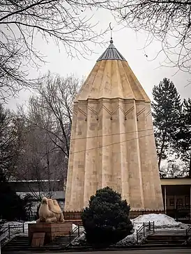 Памятник имеет необычную форму, в виде остроконечного шатра с полумесяцем на вершине, внутри которого находится саркофаг с прахом великого героя[6]. Так же на территории мавзолея расположен источник с водой, и помещение для совершения молитв.