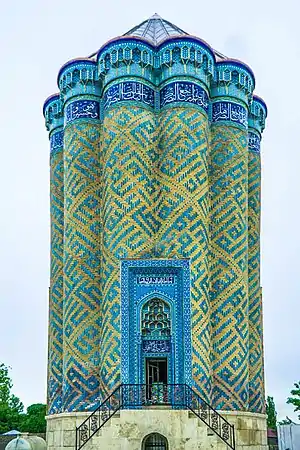 Построенный в первой половине XIV века, частично разрушен. Имеет форму цилиндра с двенадцатью полукруглыми гранями. Высота башни, имеющей внутри форму круга, составляет 30 м. На расстоянии 30 м к западу от мавзолея расположены два минарета, имеющие в нижней части в основании форму квадрата. Минареты ансамбля принадлежат XII веку[2].