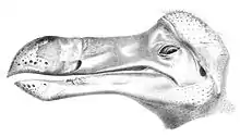 Для этой птицы был характерен половой диморфизм: самцы были крупнее самок и имели соразмерно более длинные клювы. Последние достигали 23 см в длину и имели крючок на конце[37]. Изучение некоторых из сохранившихся перьев оксфордских образцов головы показало, что они преимущественно являлись контурными, а не пуховыми, и были очень схожи с таковыми у других голубей[38].