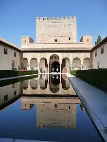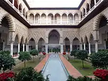 Третье любопытное мавританское здание Севильи — укрепленный дворец Алькасар, построенный в XII и получивший пристройки в XIII веке. После того, как Севилья перешла во власть испанцев, он стал дворцом кастильских королей и с тех пор неоднократно подвергался переделкам, до такой степени изменившим его внутренность, что она уже утратила определённость стиля. При всем том, общее расположение и отдельные части Алькасара сохранили восточный характер. Дворец состоит из нескольких открытых дворов, вокруг которых группируются галереи и залы, со стенами, украшенными вверху лепным орнаментом, близким по рисунку к орнаментации Хиральды, а внизу обложены цветными изразцами, представляющими геометрический узор[1].
