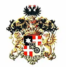 Щит четырёхчастный с малым щитком в середине. В первой чёрной части серебряная шестиугольная звезда; вторая и третья червлёные части имеют по серебряному кресту; в четвёртой золотой части — чёрное колесо со спицами. В малом щитке, пересечённом на золотое и чёрное поля, изображён двуглавый орёл переменных с полями цветов с червлёными глазами и языками, коронованный червлёными же коронами.
