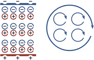 Усреднённые по объёму молекулярные токи называют токами намагничивания. Когда внешнего поля нет, токи намагничивания в среднем равны нулю, а воздействие внешнего магнитного поля на вещество связано с их появлением. Если бы они были известны, то для вычисления полей было бы достаточно уравнений Максвелла для вакуума. Молекулярные токи можно интерпретировать как круговые токи, циркулирующие в атомах или молекулах вещества.[30]