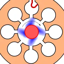 Электроны эмиттируются из цилиндрического катода в пространство взаимодействия, где на них воздействует постоянное электростатическое поле анод-катод, постоянное магнитное поле, вектор напряжённости которого перпендикулярен вектору напряжённости электростатического поля и поле электромагнитной волны.