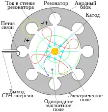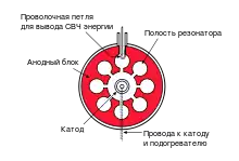 Магнетро́н — электронный электровакуумный прибор, величина протекающего тока в котором управляется электрическим и магнитным полем. Частным случаем реализации прибора (ставшим практически единственным) является вариант с выполнением анодного блока в виде резонаторных структур. Такая конструкция наделяет магнетрон способностью к генерации СВЧ-излучения при взаимодействии потока электронов с электрической составляющей сверхвысокочастотного поля в пространстве, где постоянное магнитное поле перпендикулярно постоянному электрическому полю[1].
