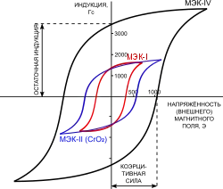 - коэрцитивная сила характеризует уровень внешнего воздействия, которое необходимо для размагничивания и подмагничивания ленты. В серийных лентах величина коэрцитивной силы составляет примерно от 350 до 1200 Э. Чем выше этот показатель, тем меньше запись подвержена влиянию электромагнитных помех и самопроизвольному размагничиванию на высоких частотах. С увеличением коэрцитивной силы уменьшается магнитная проницаемость рабочего слоя, что способствует снижению слойных и контактных потерь при записи[6][7];