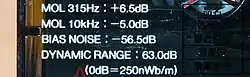 - На частотах выше нескольких кГц нормирование нелинейных искажений теряет смысл, так как записанные на ленту гармоники намагниченности выходят за пределы звукового диапазона[комм. 4]. Поэтому на высоких частотах используется предельный уровень[комм. 5] (англ. saturation output level, SOL). Обычно он измеряется на частоте 10 кГц (SOL10K)[14];