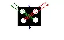 В таких датчиках измеряется падение напряжения на самом ферромагнитном сердечнике: на одни электроды, расположенные по краям подаётся от внешнего источника питания ток , а из пары других, установленных ближе к середине снимается падение напряжения , пропорциональное внешнему механическому усилию.