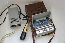 - В-третьих, для ламп нужен высоковольтный источник питания анодных цепей и низковольтный (но довольно мощный) — для подогрева катодов. В магнитофоне же требуется ещё и источник питания для электродвигателя. Таким образом, комплект батарей для портативного лампового магнитофона мог получиться довольно объёмным, тяжёлым и дорогим.