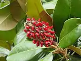 Плоды — шишкообразные, ржавоопушённые, яйцевидные или эллипсоидальные многолистовки длиной 7,5—10 см. Семена блестящие, эллипсоидальные или треугольные, по (2—6 в каждом плодике) с красной мясистой семенной кожурой, при созревании повисают на длинных семяножках (проводящий пучок), служат пищей для птиц.