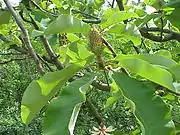 Почки опушённые, длиной 3—9 см, диаметром 0,7—1 см, светло-зелёные, осенью с легким желтоватым оттенком. Листья собранные на концах побегов, обратнояйцевидные, длиной 20—40 см, шириной 15—20 см, с закруглённым основанием, на вершине внезапно суживающиеся в короткий туповатый конец, сверху зеленоватые и голые, снизу голубовато-серые, по жилкам опушённые или голые. Черешки длиной 2,5—4 см.