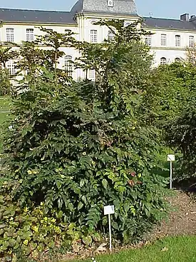 Вершинные почки ширбкояйцевидные, длиной 2—5 см, с кожистыми, узкотреугольными, вытянутыми в острие наружными чешуями, остающимися на побегах первого или второго года, внутренние чешуи широко-овапьные, тупые, травянистые, бледно-зелёные; боковые почки мельче, уже и без кожистых чешуи. Листья непарноперистые, ланцетные или продолговатые, длиной 30—45 см, несколько дугообразно вниз изогнутые, скученные на вершине побегов, из 9—13 листочков. Черешки плотные, упругие, диаметром 2—3 мм, сверху тёмно-фиолетовые, снизу бпедно-зелёные, в местах сочленения с листочками с волосками, у основания несколько стеблеобъемлющие.