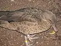 Эта утка длиной от 40 до 45 см преимущественно насыщенно-коричневая по всему верху с заметными чёрными зубцами, сильнее на боках и груди. У неё чёрное зеркало, а розовато-серый клюв немного вздёрнут.