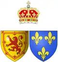 ![]() Герб Мадлен как королевы-консорта Шотландии Щит двучастный; в первой части королевский герб Шотландии — в золотом поле червлёный, вооруженный лазурью лев, окружённый двойной процветшей и противопроцветшей внутренней каймой; во второй части королевский герб Франции — в лазоревом поле три золотых лилии | |