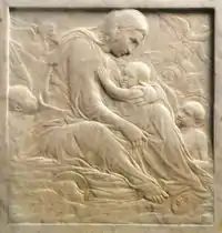 По композиции «Мадонна у лестницы» напоминает живопись, но отличается от неё. Барельеф изображает женщину, сидящую у лестницы на камне. Рядом с ней играют четверо детей — трое на лестнице, а один чуть виднеется из-за её плеча. Изображённое близко к бытовому жанру, отсюда и лестницы, и озорники-дети.