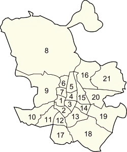 В административном плане Мадрид разделён на 21 район (исп. distritos), которые, в свою очередь, делятся на 131 подрайон (исп. barrios)[8].