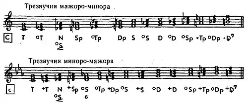 В результате смешения одноимённых ладов в мажоро-минорную и миноро-мажорную системы проникают следующие гармонии (схема дана по Ю. Н. Холопову)[5]: