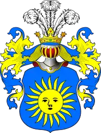 Щит лазоревого цвета поделён на четыре части золотым с широкими концами крестом. В первой и четвёртой частях золотое с человеческим лицом солнце. Во второй и третьей частях выходящее из боков щита стропило, состоящее из золотого, червлёного, чёрного и серебряного цветов. Под ним раскрытая серебряная книга.
