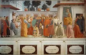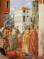Мазаччо выстроил фигуры персонажей вдоль горизонтальной линии, однако группа апостолов в центре образует явный полукруг. Исследователи считают, что этот полукруг имеет древнее происхождение, поскольку в античную эпоху так изображался Сократ с учениками, затем этот паттерн был перенесён в раннехристианское искусство (Иисус с апостолами), а в эпоху раннего Ренессанса у таких художников как Брунеллески он обрёл новый смысл — круг символизирует геометрическое совершенство и законченность. Круговое построение использовал Джотто в падуанских фресках, а также Андреа Пизано во флорентийском Баптистерии.