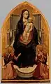 «Мадонна с младенцем и четырьмя ангелами» (135 х 73 см) была центральной панелью полиптиха. В 1855 году она хранилась в коллекции Саттона как работа Джентиле да Фабриано. В 1907 году Бернард Беренсон определил её как работу Мазаччо. С 1916 года картина хранится в Национальной галерее, Лондон. Произведение сильно пострадало; оно обрезано в нижней части, на поверхности утраты красочного слоя, обезображенные ретушью. Платье Мадонны было выполнено сияющей красной краской, наложенной на подоснову из листового серебра. Сегодня блестящий декоративный эффект произведения утрачен[21].