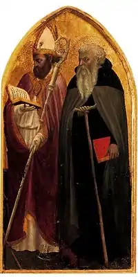 Четыре небольших панели, каждая размером 38 х 12 см, были приписаны Мазаччо, когда находились в коллекции Батлера (Лондон). В 1905 году их приобрёл Фридрих III для Берлинской картинной галереи[24]. В 1906 году германский исследователь Шубринг связал эти четыре работы с Пизанским полиптихом, высказав предположение, что ранее они украшали его боковые пилястры. Трое святых (Августин, Иероним и кармелитский монах с бородой) смотрят вправо, четвёртый влево. Все фигуры написаны так, словно свет на них падает из одного источника. Часть исследователей считает, что в этих небольших работах видна рука кого-то из ассистентов Мазаччо.
