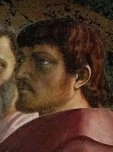 ![]() Автопортрет (в центре), фрагмент фрески «Святой Пётр на кафедре» из капеллы Бранкаччи | |