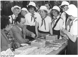 ![]() 1 мая 1954 г. Берлин. Литераторы Вилле Майнк и Ильзе Корн на книжной ярмарке Немецкого союза писателей. | |