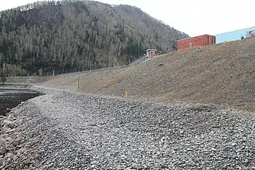- русловую и правобережную гравийно-галечниковые плотины с ядром из суглинка (фактически представляют собой одно сооружение) общей длиной 504 м и наибольшей высотой 26,7 м;