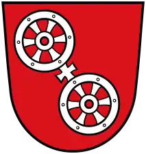 Самое раннее задокументированное появление эмблемы — на монетах архиепископа Зигфрида III фон Эппштайна (1230-1249) в виде двух кругов. Происхождение колеса неизвестно. Одна теория прослеживает её до епископа Виллигиза, который был избран архиепископом Майнца в 975 году. Согласно рассказу братьев Гримм, его предки были колесниками, и его противники высмеивали его незнатное происхождение. Они нарисовали колёса на стенах и дверях его резиденции, Виллигиз же сделал этот знак своим личным знаменем с девизом «Виллигиз, помни, откуда ты пришёл». Однако это не доказано, и в любом случае гербы появились только в XII веке. Большинство архиепископов Майнца использовали колесо для первого и третьего полей своего личного герба, используя герб своей семьи для второго и четвертого полей. Согласно более сложным интерпретациям, изображение двух колёс, соединённых крестом, происходит из монограммы-хризмы или из атрибута святого Мартина,[2] которому посвящён кафедральный собор Майнца.