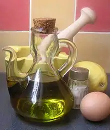 Майоне́з (фр. mayonnaise) — холодное блюдо, приготовленное из растительного масла, яичного желтка, горчицы, уксуса (или лимонного сока[2]), соли[2] и сахара[3].