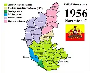 В 1956 году правительством Индии был принят Акт о реорганизации штатов. В соответствии с этим актом административное деление страны должно было быть реорганизовано так, чтобы штаты стали моноязычными. В связи с тем, что значительная часть говорящих на языке каннада уже проживала на территории штата Майсур, его было решено сделать ядром каннадаязычного штата, поэтому к нему были присоединены штат Кург, южная часть штата Бомбей и западная часть бывшего штата Хайдарабад.