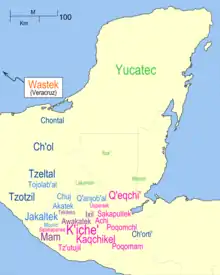 Распространение современных майяских языков (цвета соответствуют группам, размер шрифта — числу говорящих).