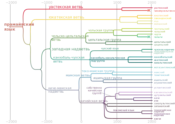 - восточночольская подгруппа: иероглифический майя †, чольти † (классический язык майя †), чорти