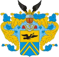 Щит увенчан дворянским шлемом с дворянской на нем короной, на которой видны два орлиных распростёртых чёрных крыла. Намёт на щите золотой, подложен голубым.