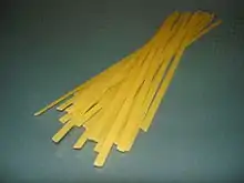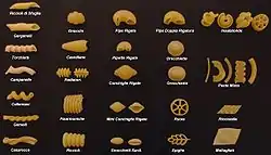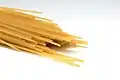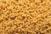 Макаро́нные изде́лия — изделия различной формы из высушенного теста, замешанного из пшеничной муки и воды[3]. Как правило изготавливаются промышленным способом. В домашних условиях изготавливают лапшу, формально не относящуюся к макаронным изделиям, так как она обычно не подвергается сушке и употребляется сразу же после приготовления, в отличие от длительно хранящихся макаронных изделий (до двух лет[4]).