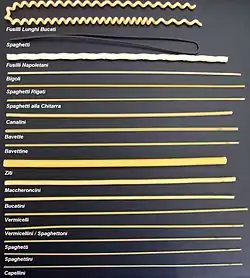 - Вермишель (vermicelli; от verme — червь) — длинные, округлые и достаточно тонкие (1,4—1,8 мм);