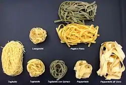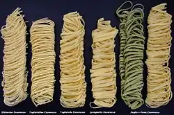 - Тальятелле (tagliatelle) — тонкие и плоские полоски яичного теста шириной около 5 мм. Отличающиеся от феттуччине, в основном, только меньшей шириной (разница составляет минимум 2 мм).