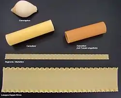 - Cannelloni — каннеллони — трубочки диаметром до 30 мм и длиной до 100 мм, один из первых видов макарон, придуманных людьми. С давних времен их готовили из теста, замешанного на воде из смолотого зерна с солью, затем тесто раскатывали и нарезали на прямоугольники, на которые клали начинку, сворачивали в трубочку и затем варили