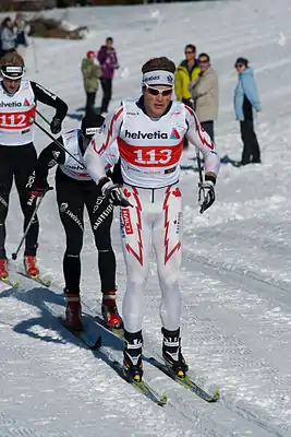 Использует лыжи производства фирмы Fischer, ботинки и крепления Salomon.