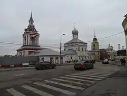 Улица Варварка. Слева направо: колокольня Знаменского монастыря, церковь Максима Исповедника, храм Великомученицы Варвары. Максимовский переулок начинался между церковью Максима Исповедника и колокольней Знаменского монастыря
