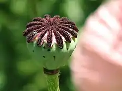 Плод — сизая, голая, обратнояйцевидная коробочка, 2—3 см длиной; диск плоский, с (8)13—15 лучами, плёнчатый, зубцы его короткие, тупые, почти усечённые, жёсткие.
