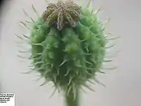 Плод — широко-овальная, довольно крупная коробочка, 10—14 мм длиной, покрытая жёсткими, отстоящими и часто несколько назад отогнутыми щетинками. Семена чёрные, округлые, с прямоугольной крупной сеткой ячеек.