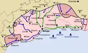 14 января мятежники начали наступление вдоль берега при содействии флота (9 кораблей, в том числе крейсера «Канариас» и «Сервера»). С захватом Сан-Педро и Марбельи 17 января мятежники выполнили первую часть плана, после чего наступление с востока и 23 января заняли Альхаму.