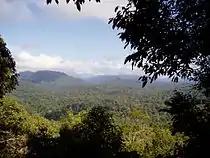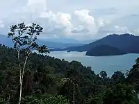 Полуостровная часть составляет около 39,7 % от общей площади Малайзии и простирается на 740 км с севера на юг и на 322 км с запада на восток (в самом широком месте). Через центральную часть полуострова проходит горный хребет Титивангса; высочайшая точка полуострова — гора Гунунг-Тахан (2187 м над уровнем моря). Береговая линия полуостровной части страны составляет 1931 км, удобные бухты имеются только на западном побережье. Восточная часть страны составляет 60,3 % от общей площади, имеет береговую линию длиной 2607 км. Между штатами Саравак и Сабах проходит горный хребет Крокер, где находится самая высокая точка страны — гора Кинабалу (4095 м)[19]. Горные хребты тянутся также вдоль границы с Индонезией. Между двумя частями страны расположено множество принадлежащих Малайзии островов, самым крупным из которых является Банги.