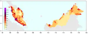 - Восточная Малайзия (традиционное название — Сабах и Саравак)[8][9][10] занимает северную часть острова Калимантан с прилегающими островами, граничит с Брунеем на севере и с Индонезией на юге[11][12], имеет также морскую границу с Филиппинами.